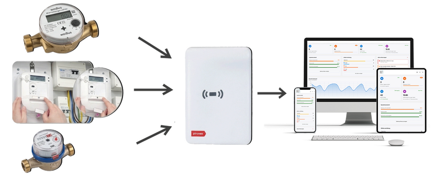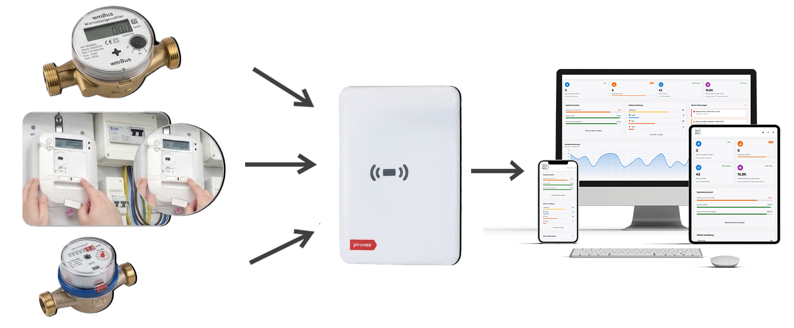Die UVI-Gateways der pironex sind WM-Bus Gateways und bieten eine hochsichere Lösung zur Erfassung, Entschlüsselung und Verarbeitung von OMS-Daten aus Funkzählern. Die Versorgung der wM-Bus Gateway erfolgt durch Batterien oder aus einer 230V-Spannungsversorgung. Dank direkter Integration mit dem pironex-IoT Portal lassen sich Verbrauchswerte effizient visualisieren und für das Energiemanagement nutzen.